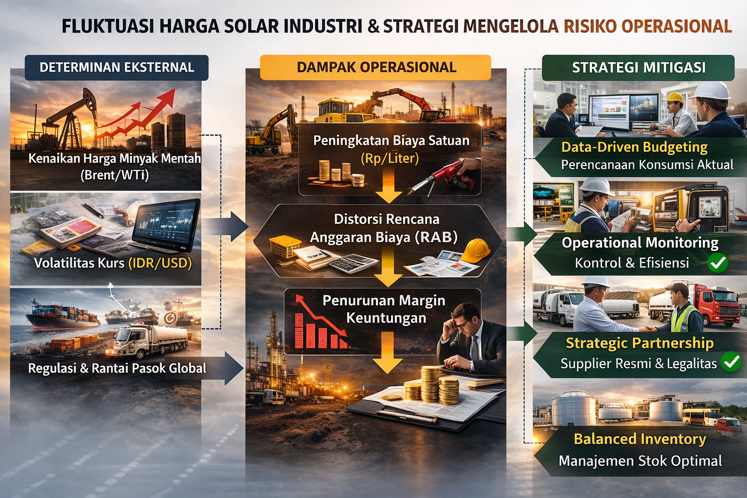 Maka saat ini, dampak fluktuasi harga solar bukan hanya isu pasar energi, melainkan risiko bisnis yang harus dikelola secara manajemen dan strategis yang baik.