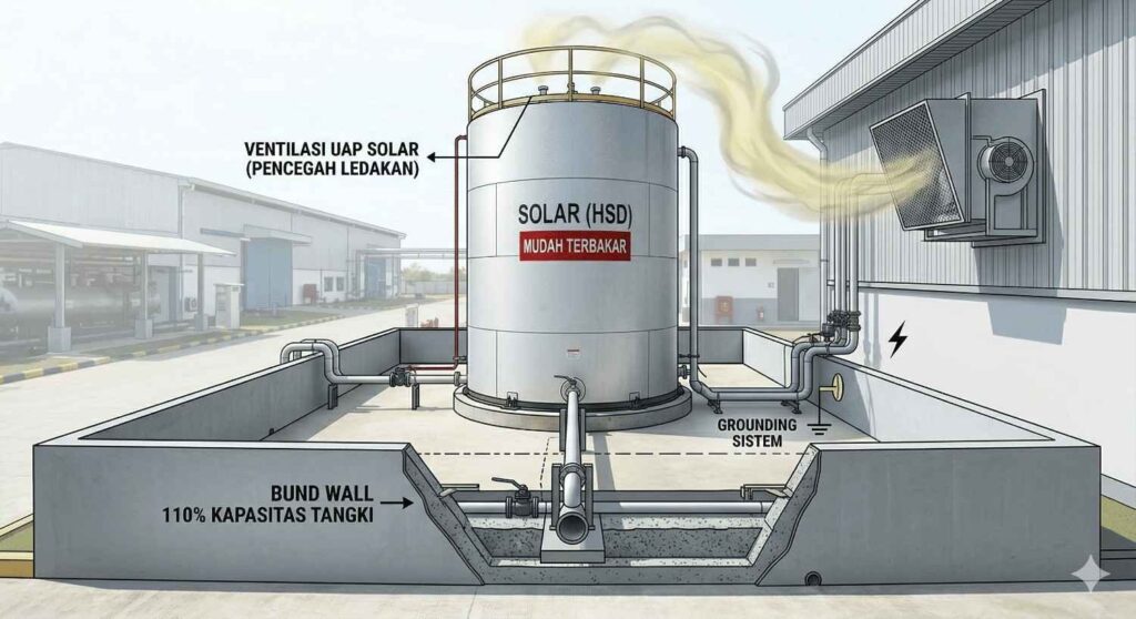 Uap solar yang terperangkap di ruangan tertutup adalah resep sempurna untuk ledakan. Pastikan sirkulasi udara di area storage berjalan optimal agar konsentrasi uap tetap di bawah ambang batas bahaya.