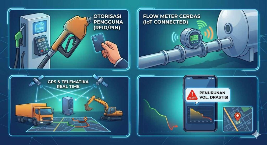 Sistem manajemen bahan bakar modern dilengkapi alarm yang berbunyi saat ada penurunan volume secara mendadak atau pengisian di waktu tidak wajar. Western Global menjelaskan bahwa real‑time monitoring dan alarms memudahkan penemuan aktivitas mencurigakan serta mengirim notifikasi melalui email atau aplikasi. Selain itu, beberapa sistem mewajibkan penggunaan PIN atau kartu RFID agar hanya karyawan berwenang yang dapat mengeluarkan solar.